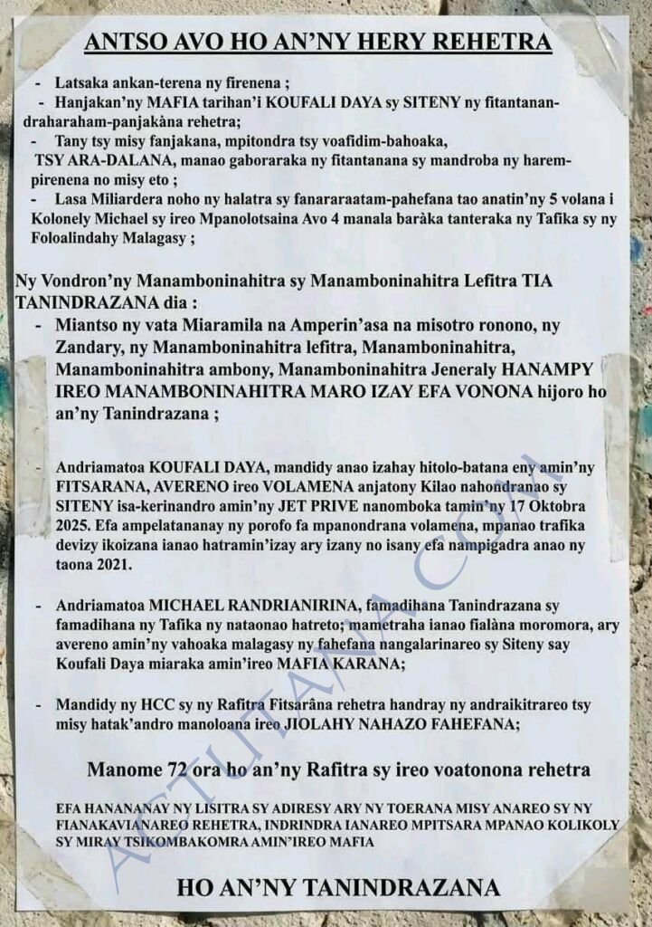 En vrac et dans le désordre : les Gen Z et Y qui sont montés au créneau, la maire de Tana qui se fait éjecter, idem le Premier Ministre et tout son gouvernement, les nouvelles révélations fracassantes du Colonel Patrick, qui mettent nommément en cause toutes les instances dirigeantes de cette Refondation